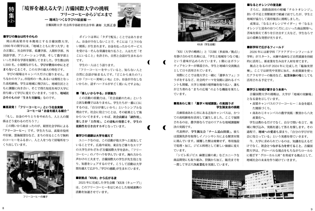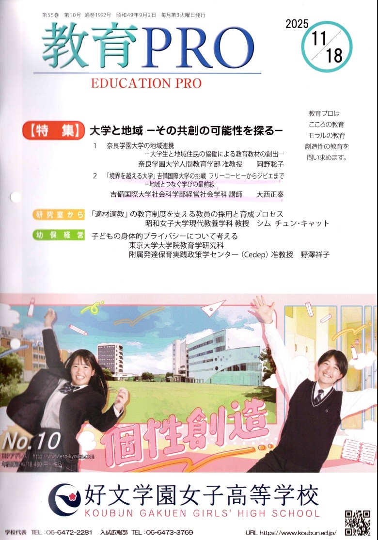 - 教育情報誌『教育PRO』において、大西正泰先生の特集記事「『境界を越える大学』吉備国際大学の挑戦:フリーコーヒーからジビエまで−地域とつくる学びの最前線−」が掲載されました。『教育PRO』は、教育現場や学校経営・学校改革を主なテーマとする定期刊行誌で、発行元はERP教育研究所(株式会社ERP)です。同誌は教育政策、生徒指導、進路支援などの課題を幅広く扱い、学校現場の「今」の論点を提供する専門誌として位置づけられています。
