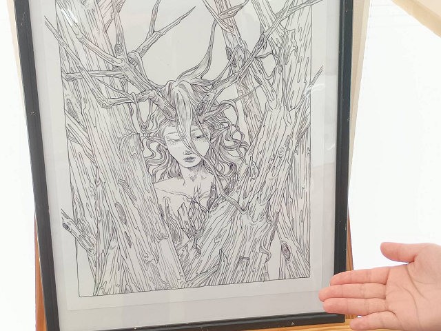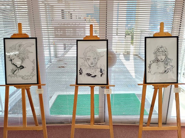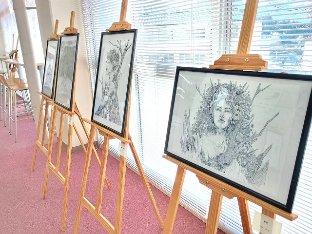 アニメーション学科の学生2名による点描画作品12点を展示し、一つひとつの点が積み重なって生み出される豊かな表現力や、線描による力強さと繊細さが同居する作品の数々に、来館者は心を奪われています。