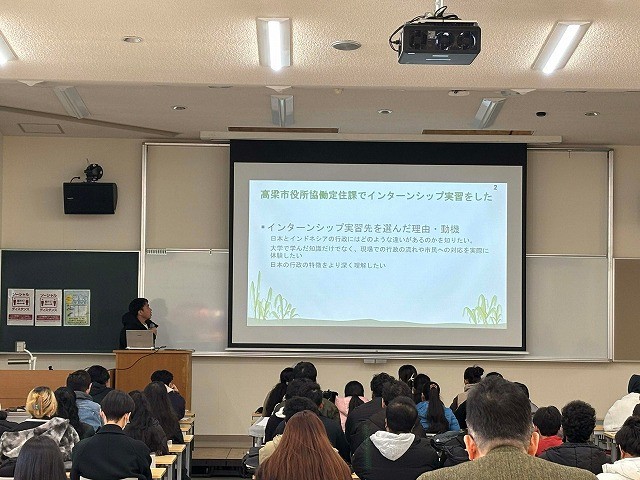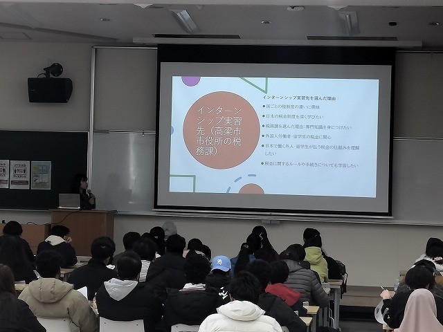 この科目を履修した3・4年生4人が、授業の一環として高梁市役所や高梁市図書館でインターンシップ研修に取り組みました。2025年12月18日にインターンシップ報告会を開催し、インターンシップ研修に参加した学生が、インターンシップ研修をつうじて学んだことや研修に参加して理解を深めたこと、今後の展望について発表しました。インターンシップ研修に参加した学生は一様に、仕事に取り組む姿勢として、施設利用者や住民の立場になって丁寧に対応するとともに、職員同士が協力するために相手の話をしっかりと耳を傾けてコミュニケーションを図ることが大切であることを強く実感し、働くうえで相手の目線で物事を見て考えることの重要性を再認識したようです。また、自分が考えた企画が形になることに喜びや達成感を感じるなど、自分の適性を知ることができたようです。