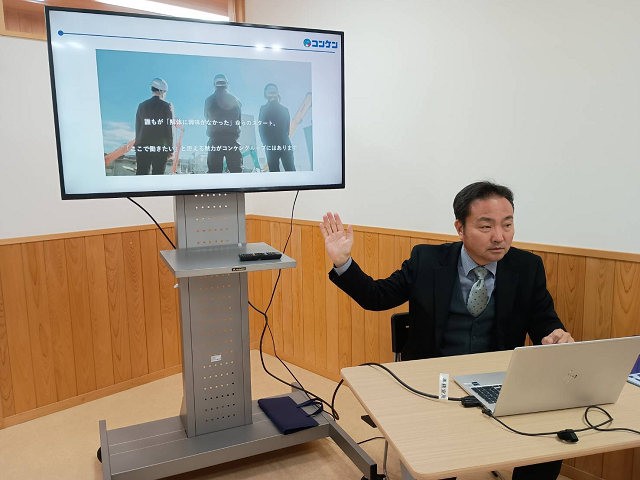 この日、同社採用担当者による、コンケングループそして同社の事業内容、さらには同社代表取締役社長のインタビュー動画も流されました。「主体性をもって、裁量権をもって仕事がしたい人を募集しています。施工管理の職という現場の指揮官、プレイングマネージャーとなって活躍してみませんか?」と学生らにメッセージが送られました。