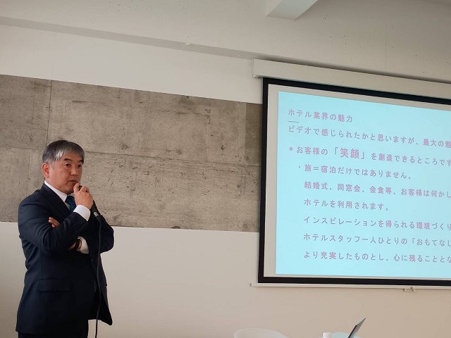 株式会社レイは、JR岡山駅に直結している「ANAクラウンプラザホテル岡山」を所有、経営している企業です。この日は、ホテルの業務内容「フロントレセプション」、「レストラン&バーサービス」、「宴会サービス」についての説明や、学生と社会人の違いなど、同社の代表取締役 林健一 様による説明を、学生らは聞くことができました。また、「チームで協力できる人」、「人と話すことが好き、誰かと関わることが好きな人」、「体力に自信がある人」、「変化に対応できる柔軟性がある人」、「語学や国際交流に興味がある人」はホテル業界に適しているとのアドバイスがありました。