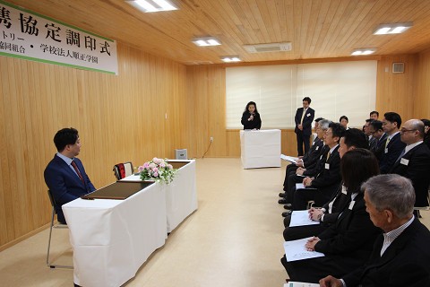 3月29日(金)、吉備国際大学岡山キャンパス(岡山市北区)にて行われた教育提携協定調印式では、同社代表取締役で同組合代表理事でもある江見 慎之介 氏と本学園の加計 美也子 理事長が提携書にサインしました。