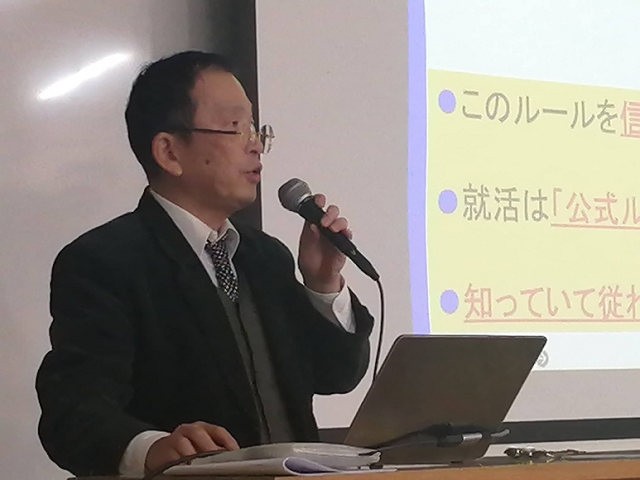 当日は司会の大西先生による「履歴書に何を書くのか?」という導入、キャリア教育担当福本先生による「イマドキの就職活動(の変化)について」の話題提供に続き、4年生池田琳さんが司会を務めるトークセッションが行われました。