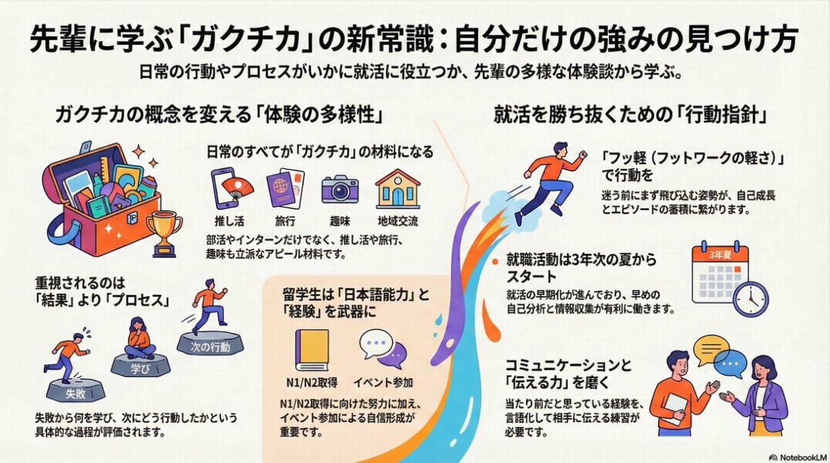 • 就活への意識:「3年生の夏から就職活動が始まると聞き、早めの準備が必要だと感じた。自己分析を行い、自分の強みや弱みを言葉にする練習をしていきたい」