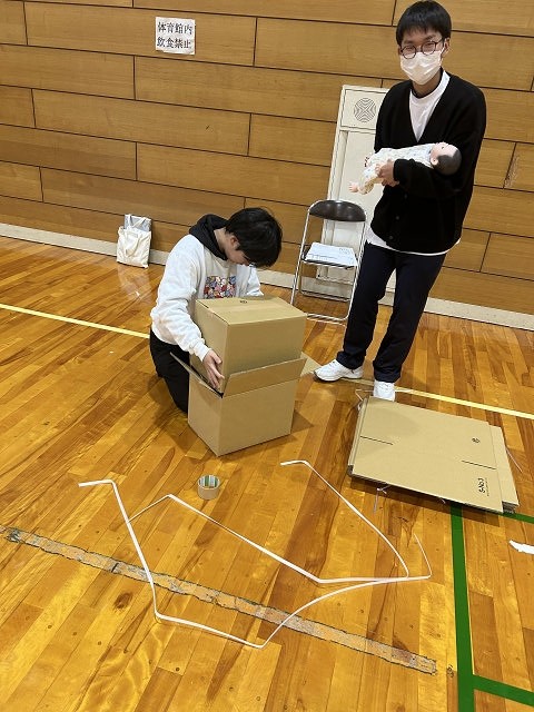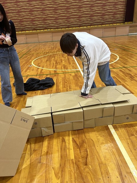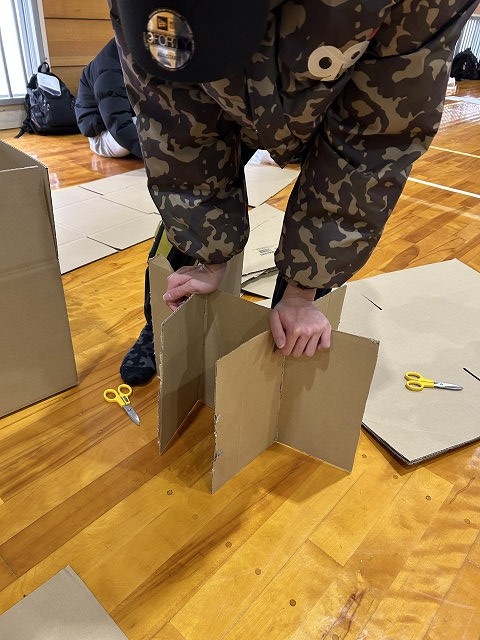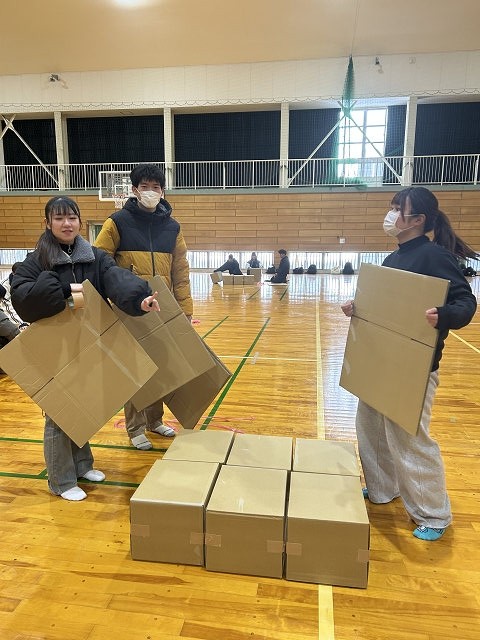 - 被災後の避難所開設として、段ボールベッドの作成や避難所の設営を検討するディスカッションをしました。