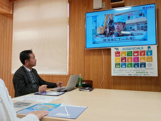 この日、同社採用担当者による、コンケングループそして同社の事業内容、さらには同社代表取締役社長のインタビュー動画そして若手社員から就活生に向けたメッセージ動画も流されました。