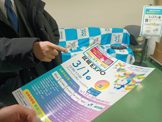 就職活動が本格化する直前のこの時期に、就活準備を頑張る3年生に向けて、今後知っておくべき情報を届けるために、今回のイベントは行われました。この日は、マイナビ社の就職情報事業本部スタッフ2名が来訪、学生らに声掛けし、今後のイベント案内やスマートフォンのマイナビアプリの新機能の紹介や使い方などを説明しました。説明を聞き終えた学生には、マイナビ社の方から、就活応援グッズとして、業界地図やドリンクが手渡されました。受け取った学生らは、いよいよ迫ってきた就活本番に向け、今後のスケジュールを確認するなど、これからの進路選択に向けて備えを始めている様子がうかがえました。