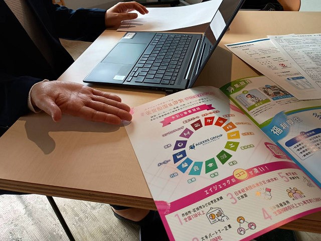 エイジェックは、グループ全体で51社、18,400名の社員が多様な事業を展開しており、グループ売り上げは1,276億円という規模の大きな企業です。この日は、人材・雇用に関わる業務を中心に、同社の事業内容や特徴など説明がありました。また、同社では、14ある職種や全国にある73拠点から勤務地を選択でき、研修制度や入社後にも選べるキャリアチェンジ制度といった特徴についても説明がありました。