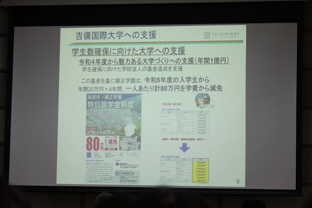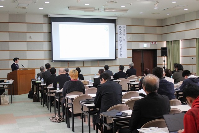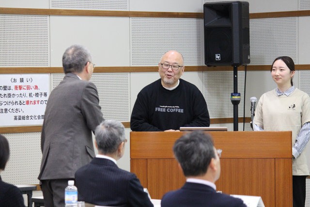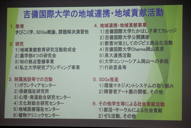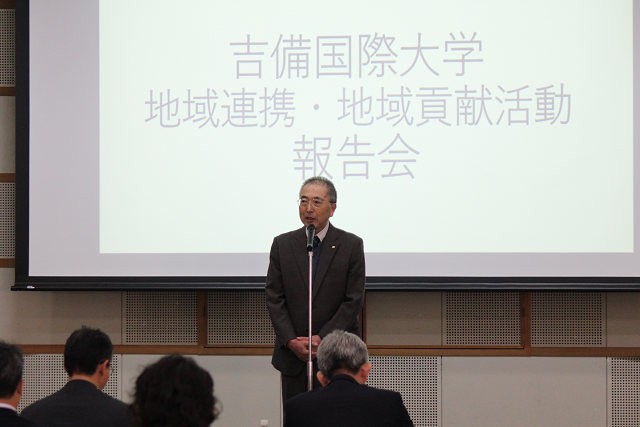 この日の報告会には、石田芳夫 高梁市長そして福本和宏 高梁市教育長らおよそ50人が、吉備国際大学の地域連携活動や活動事例、高梁市と大学の連携事業などの報告に耳を傾けました。