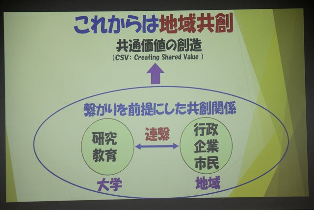 報告会終盤では、井勝久喜 吉備国際大学学長特命補佐から、地域連携活動における大学側や自治体側の課題が示されました。これまでは教育・研究・社会貢献が分断された地域連携であったものを、これからは大学と地域が共通価値を創造する「地域共創」となるよう展望が述べられ、地域構想プラットフォームの中で、コーディネーターの配置が必要といった考えが出されました。