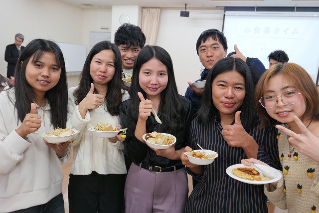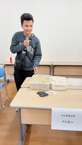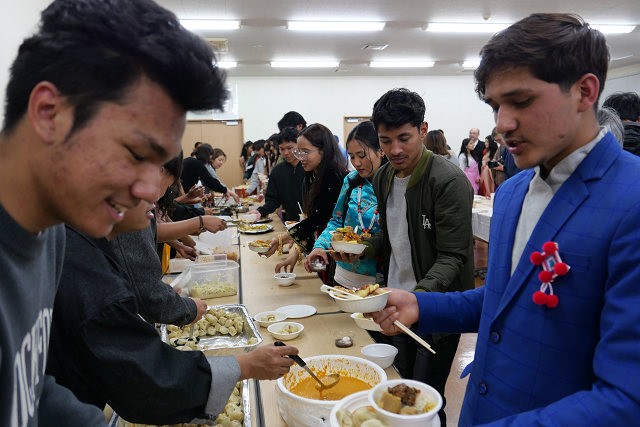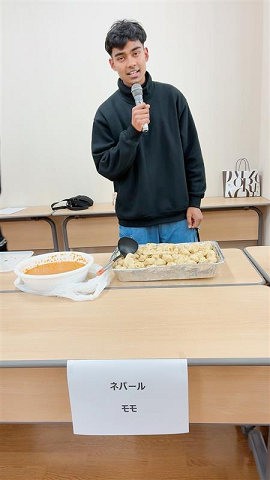 会場のテーブルには、留学生たちが腕を振るった母国の代表料理が並びました。インドネシアのナシゴレン、ネパールのモモ(蒸し餃子)、スリランカのチキンカレーやフライドライス、ミャンマーの伝統菓子サヌイマキンのほか、日本のお好み焼きや白玉ぜんざいなど、さまざまな国の料理が振る舞われ、その本格的な味わいに参加者からは歓声が上がりました。