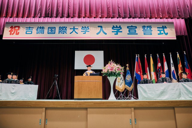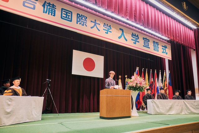 中瀨学長から427名の入学が許可されると、新入生を代表しアニメーション学科 安藤さんが「吉備国際大学生としての自覚と高い志を持って、国際社会の期待にこたえることができるように日々精進することを誓います」と宣誓しました。