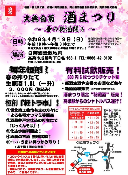 2026年4月19日(日)、岡山県高梁市成羽町の白菊酒造株式会社にて、「大典白菊 酒まつり ~春の新酒開き~」が開催されました。晴れ渡る春の空のもと、地域内外から多くの日本酒ファンが訪れ、にぎやかな一日となりました。