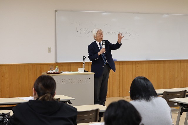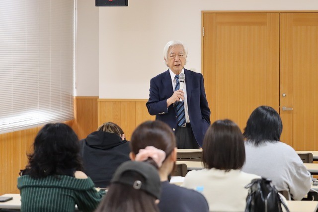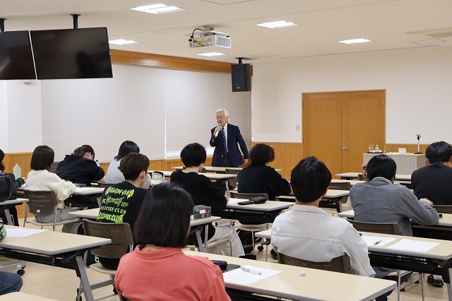外国語学部外国学科の授業科目「生き方」にて、公益財団法人大原美術館の名誉館長 大原謙一郎先生による授業が、4月22日に岡山キャンパス(岡山市北区)にて行われました。本年度授業としては第2回目になります。