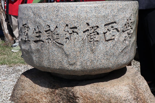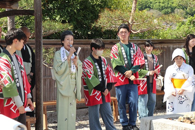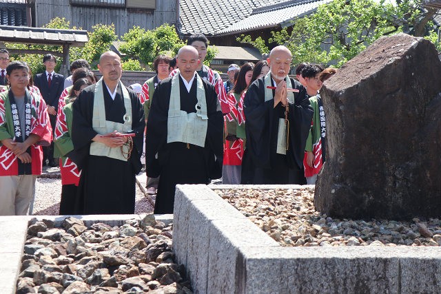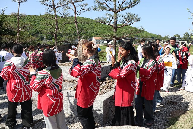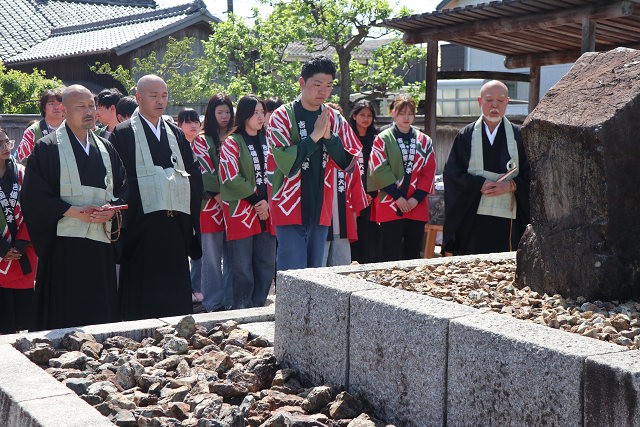 4月25日(土)、岡山市北区にある栄西禅師の生誕地にて、臨済宗建仁寺派 川本博明 宗務総長による栄西禅師の御法要を執り行った後、法被姿の外国学科1年生が中心で、浴衣姿の地域住民の皆様と一緒に、およそ70名が石碑のまわりを輪になって、栄西踊りを奉納しました。