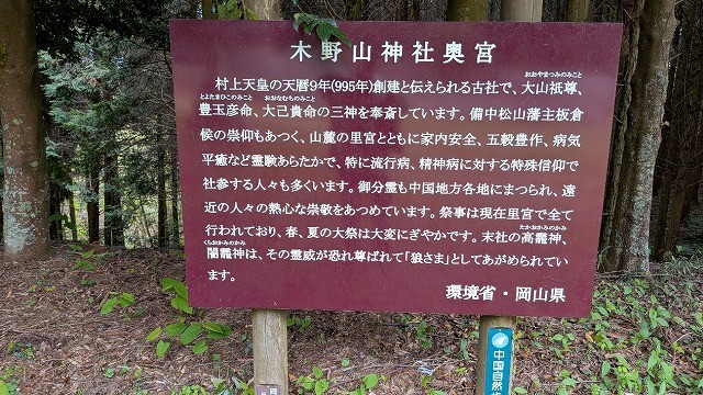 今回、立項したのは高梁市津川町今津にある木野山神社です。木野山神社は下記立て看板にもあるように流行病や精神病に関する特殊信仰で参拝されることも多い神社です。これは木野山神社が狼を祀っていることに由来します。